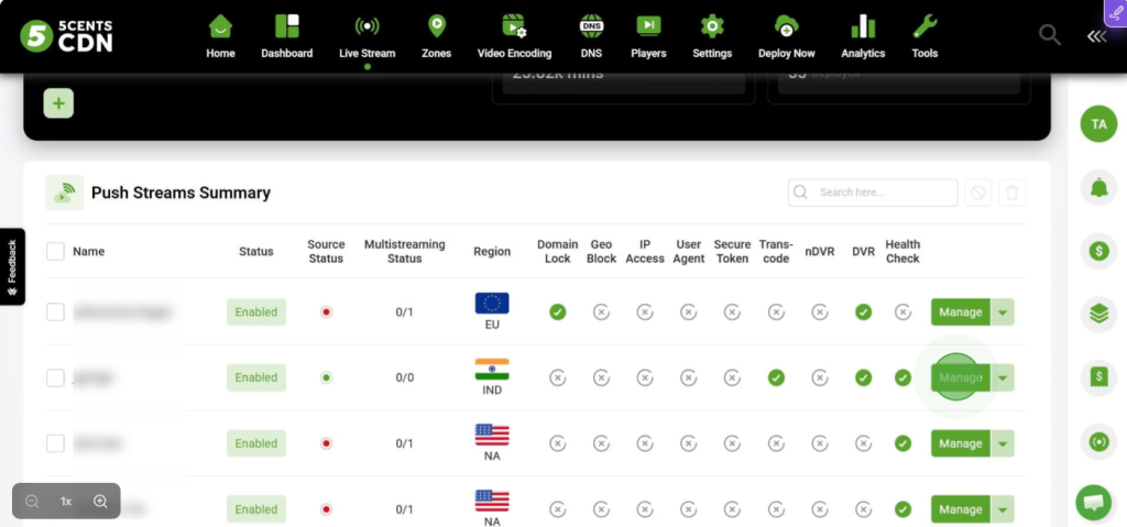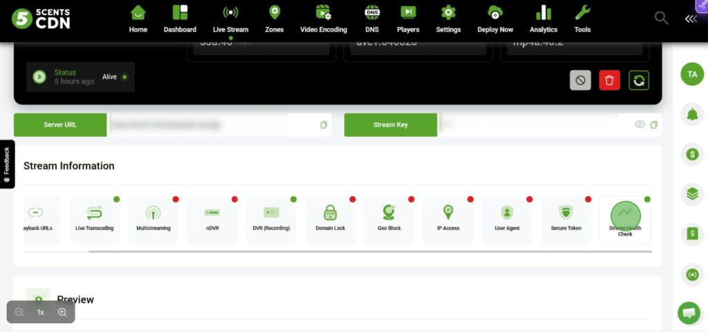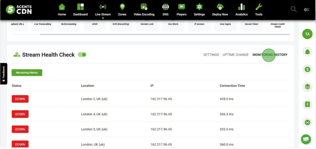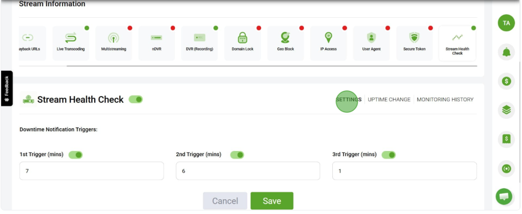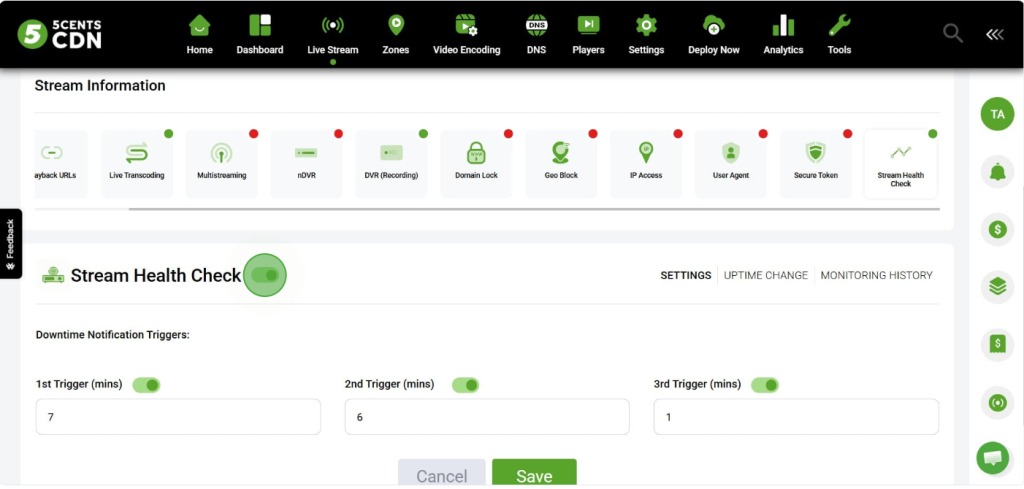 The Stream Monitoring (Health Check) feature allows you to automatically monitor the health of your live streams. When enabled, the system checks the stream status at regular intervals and helps you quickly identify issues such as stream interruptions or source failures.