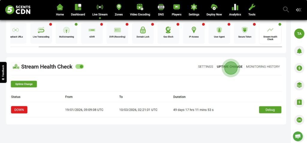 The Uptime Change tab provides detailed information about the stream’s status changes, including when the stream goes online (Up) or offline (Down).