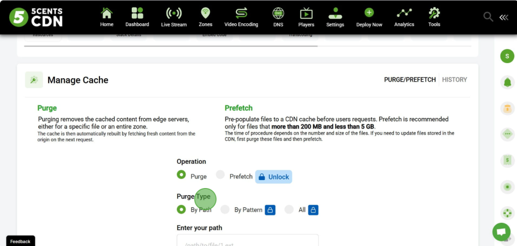 Please note that Purge All, Purge by Pattern, and Prefetch are advanced features and are not available for basic users. The Purge All option is only available for HTTP Pull Zones, which are optimized for HTTP delivery. To enable these advanced features, users must have a minimum plan commitment of $250 per month. If you wish to enable any of the advanced features, please contact our sales team directly.