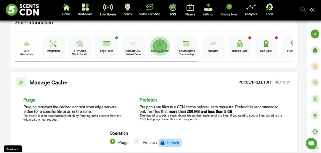 Select operation purge for purging the cache of the files from the CDN servers, operation Prefetch pull the new files from the storage and cached to all the edge servers. It will makes the delivery faster.
