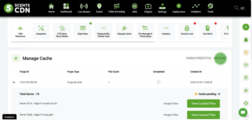 You can go to the History tab to view the purge history. It lists each purge request and shows details such as the servers from which the cache was purged.
